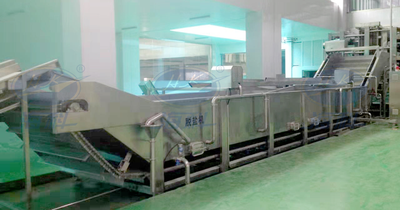 該機是海科在結合用戶的工藝基礎上,吸收國外先進技術,自主創新設計制造的自動化設備,特別適合用于醬菜行業的產品生產;把腌制過得蔬菜如蘿卜、榨菜、青菜等,通過鼓泡、沖浪和漂洗作用把高鹽度的腌制菜清洗干凈,同時也把鹽度降下來。