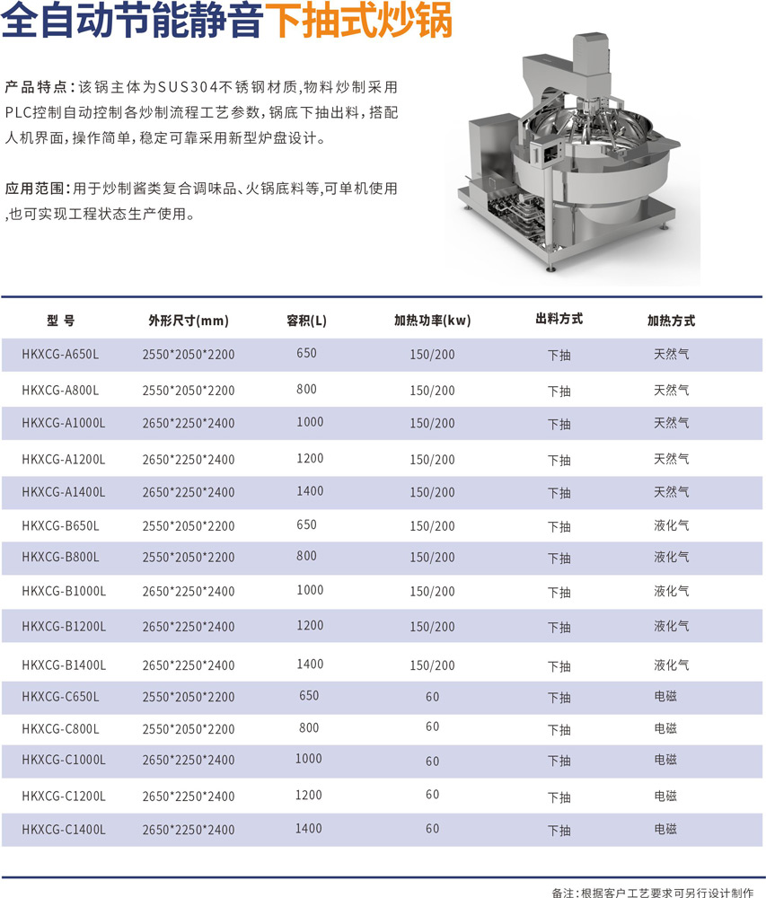 該鍋主體為SUS304不銹鋼材質(zhì),物料炒制采?PLC?動(dòng)控制各炒制流程?藝參數(shù),液壓翻轉(zhuǎn)出料,搭配?機(jī)界?, 操作簡(jiǎn)單,穩(wěn)定可靠,采?新型爐盤(pán)設(shè)計(jì)。