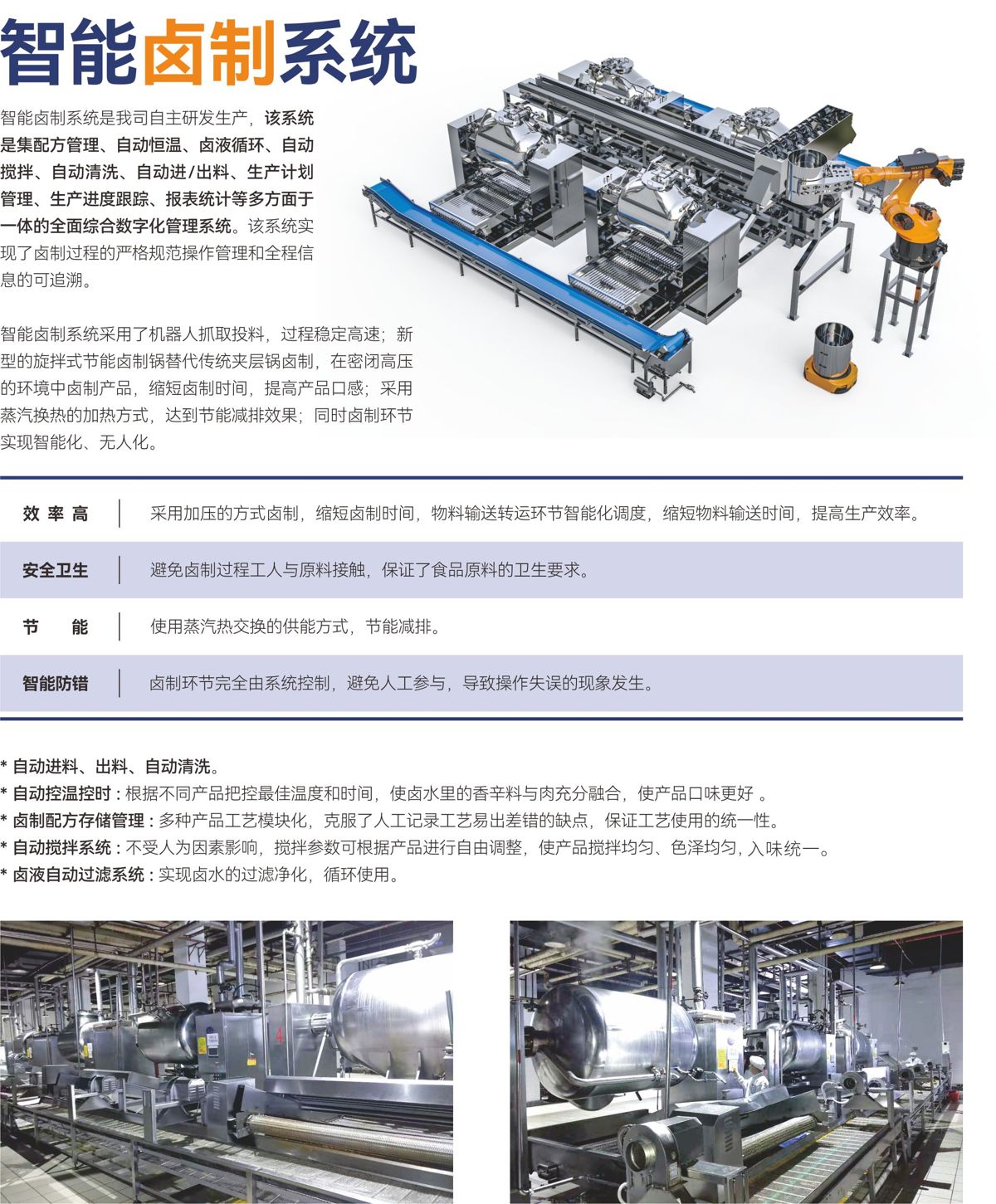 該系統是我司自主研發生產,集配方管理、自動恒溫、鹵液循環、自動攪拌、自動清洗、自動進/出料、生產計劃管理、生產進度跟蹤、報表統計等多方面于一體的全面綜合數字化管理系統。該系統實現了鹵制過程的嚴格規范操作管理和全程信息的可追溯。
