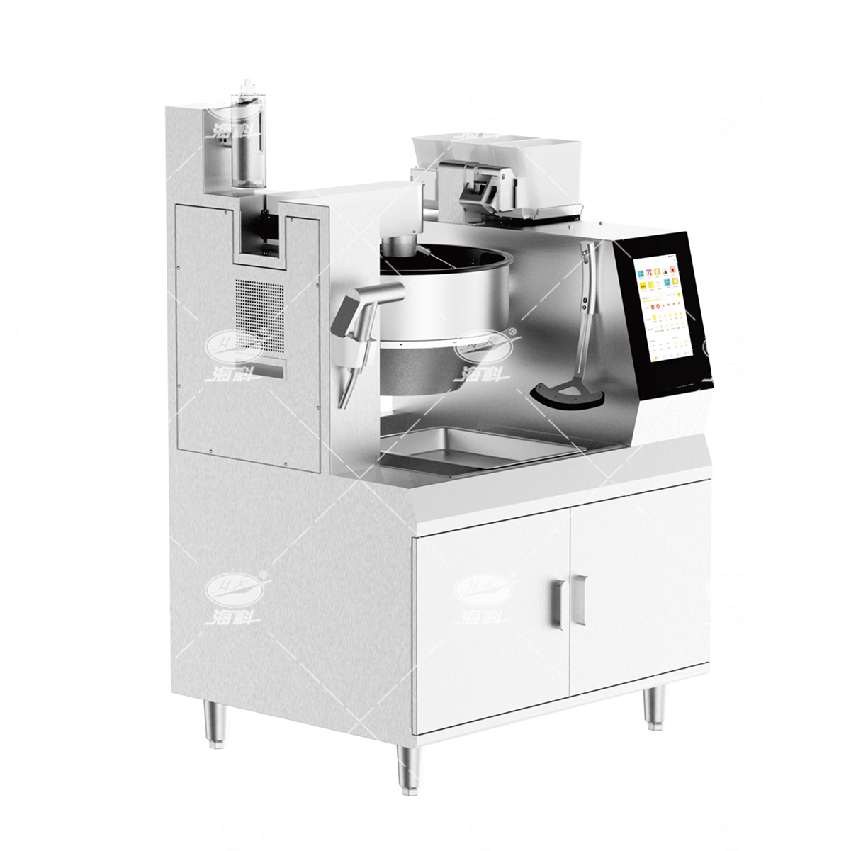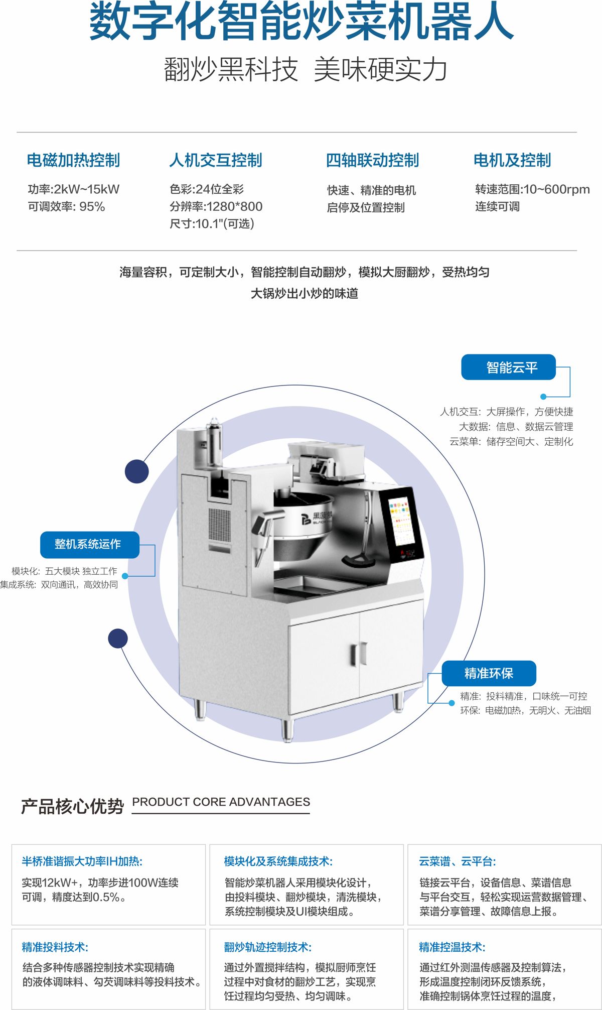 數字化智能炒菜鍋則根據指令按菜品工藝執行炒制、按配方進行調味,機器手執行抓取凈菜/調理肉/調料等動作,各模塊協同運作,全面保障烹飪、調料、出餐持續穩定流暢進行。同時,小炒系統配置自動清洗功能,菜品炒制結束任務結束后,自動進行清洗。